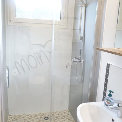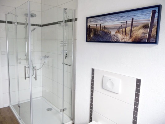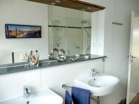Kleineres Bad (erstes Bild) und großes Badezimmer mit Dusche, WC und Waschbecken